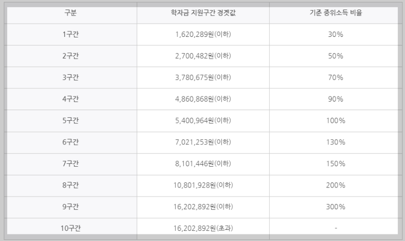 학자금 지원구간 경곗값은 아래 표와 같이 기준 중위소득 비율에 따라 1구간 ~ 10구간으로 나뉩니다.