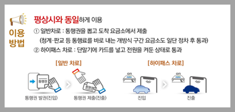 일반 차로는 현장에서 요금을 결제하지 않으며, 하이패스 차로는 단말기에서 “통행료 0원 정상 처리되었습니다.”라는 안내 멘트가 나오니 참고하시면 됩니다.